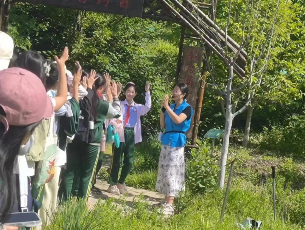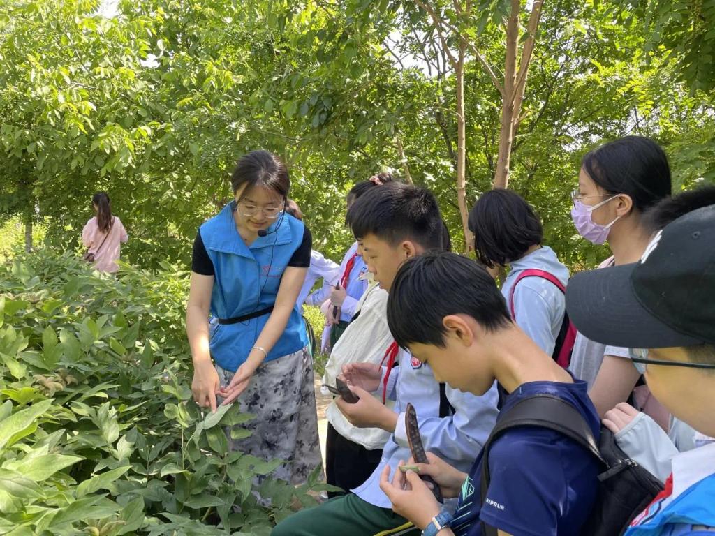 研学第一站,同学们来到了如意药岭,参观中药植物园科普基地,开启了探秘传统中草药的药山研学之旅。中药制药工程学院学生志愿者带领小学生们观察了各种中草药的外观形态,近距离了解各个品种的中药材。学院学生志愿者向同学们直观和生动地讲解了各种中草药的识别方法和医用价值,用通俗易懂的语言为同学们介绍了传统中草药植物的萌新、开花、用药等的基本流程,并向同学们讲解如何在日常中观察和辨识最基本的中草药植物。