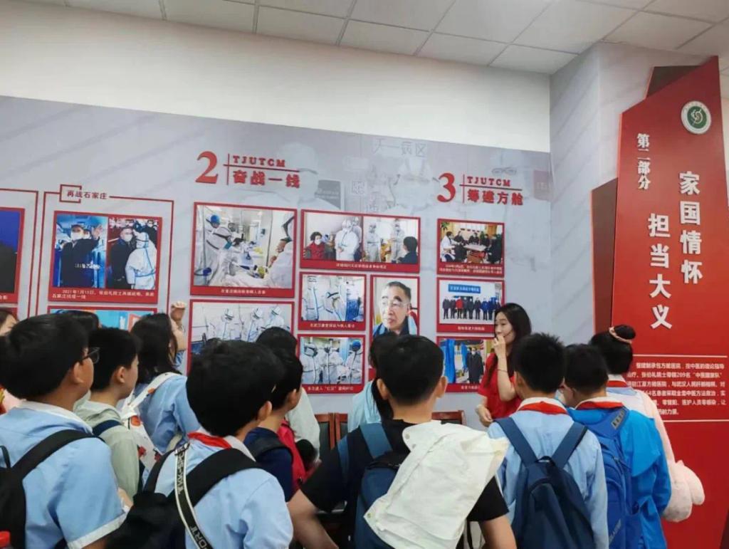 研学第三站,同学们来到“人民英雄”张伯礼抗疫事迹展,展室记录了我校名誉校长张伯礼院士在疫情期间“肩负使命,不负人民”的抗疫事迹。现场讲解员王甜同学为小学生们介绍了疫情期间年过七旬的张伯礼院士临危受命,逆行武汉,在80多天的战“疫”中,舍生忘死挽救生命的抗疫历程。在参观过程中,同学们也了解到以张伯礼院士为代表的中医人在抗疫中深度参与诊疗的全程,张伯礼院士用传统与现代相融合的方法,为形成抗疫“中国方案”贡献了智慧和汗水。小学生们被一张张照片背后的故事深深打动,更加直观地了解了中医药传承精华,守正创新的强大力量。