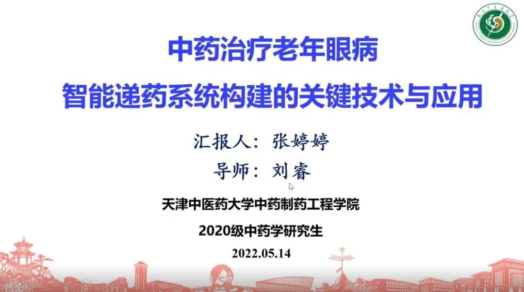 张婷婷学姐为2020级硕士研究生,本次汇报课题为《中药治疗老年眼病智能递药系统构建的关键技术与应用》。在现代中医药发展上升为国家战略高度和眼部亚健康问题日益增重的背景下,张学姐向同学们讲解了开发新型智能眼部递药系统的创新性和紧迫性。随后,她从智能纳米递药系统设计,新型修饰材料筛选,智能评价技术开发等方面详细介绍了研究内容。在提问环节中,张学姐谈到“当研究一个新方向不知道从何做起时,不要局限于眼前这个领域,要学会放宽视野,可以参考一些其他领域的研究,多去查阅文献,然后内化成自己的眼界和知识,建立一套自己的知识管理系统。”